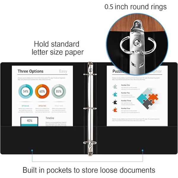 The slim three ring binder is .5 inch and can hold 100 sheets of paper. The round rings are back mounted which leaves a smooth spine so papers will lay nicer and turn effortlessly. Compact, efficient, and economical
