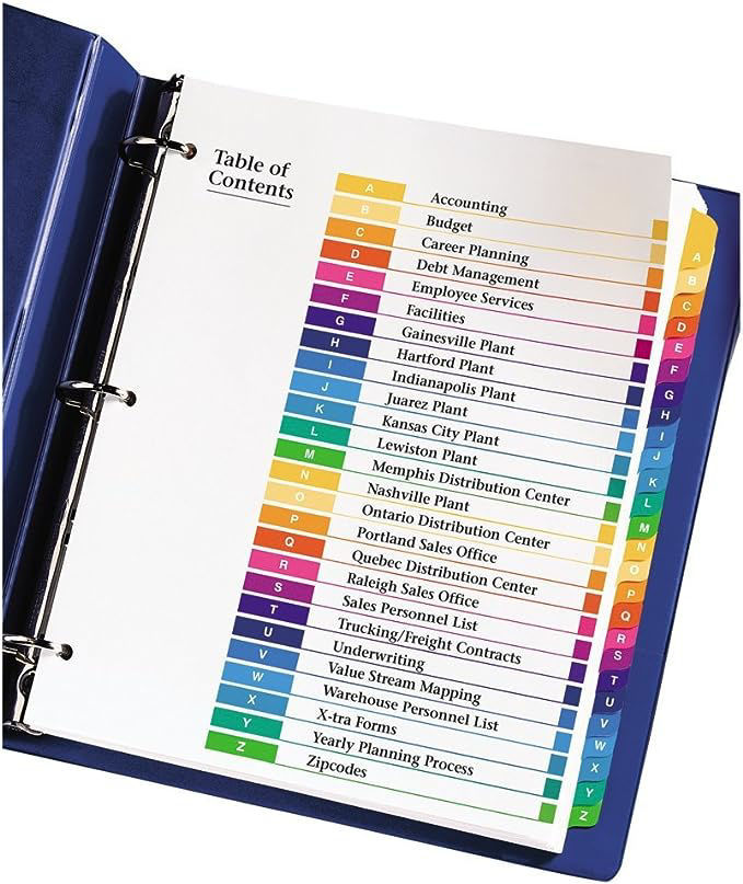 - Each divider features a reinforced table of contents page that allows for easy customization and indexing of specific content.