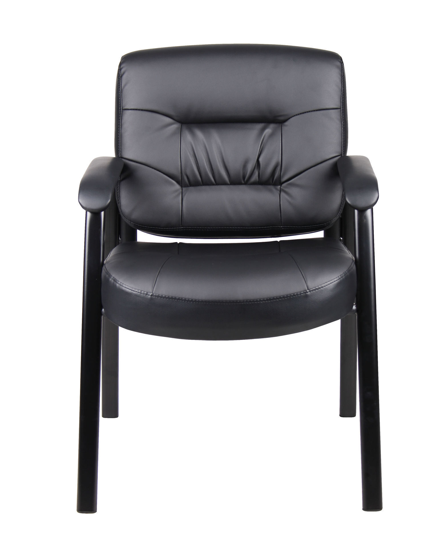 This guest chair Is the perfect companion piece to any of our executive LeatherPlus chairs. Like its counterparts, it is beautifully upholstered with black LeatherPlus, a leather and polyurethane combination that provides softness and durability in equal measure. Its armrests are covered with Caressoft upholstery and its legs are constructed from black steel. It has an overall arm height of 26-inch, a seat size of 20-inch W x 17-inch D, and a seat height of 19.5-inch.