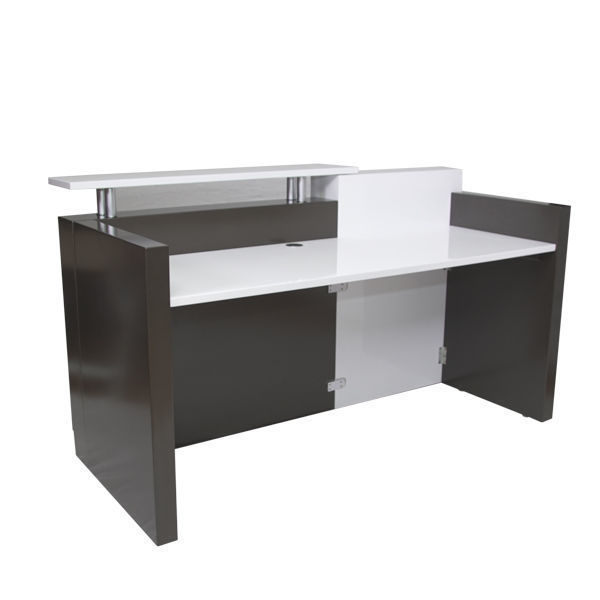 - This eye-catching yet functional reception desk features a height and durable worksurface that will allow you to effectively help all guests as they enter the space. It has a grommet hole to help keep wires, cords and cables organized and out of sight.