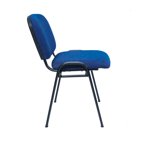 This side chair features a comfortable padded seat and back upholstered in a stylish blue fabric with a black tubular steel frame.