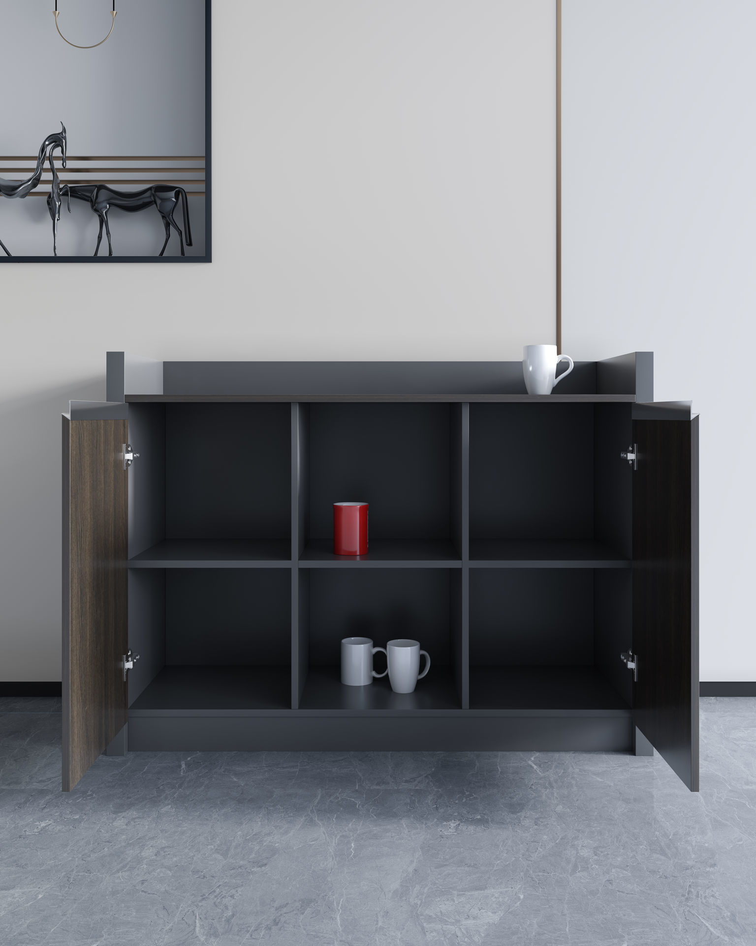 - This cupboard can be placed behind you desk to act as a credenza, used for additional storage space or a coffee/tea station for the office