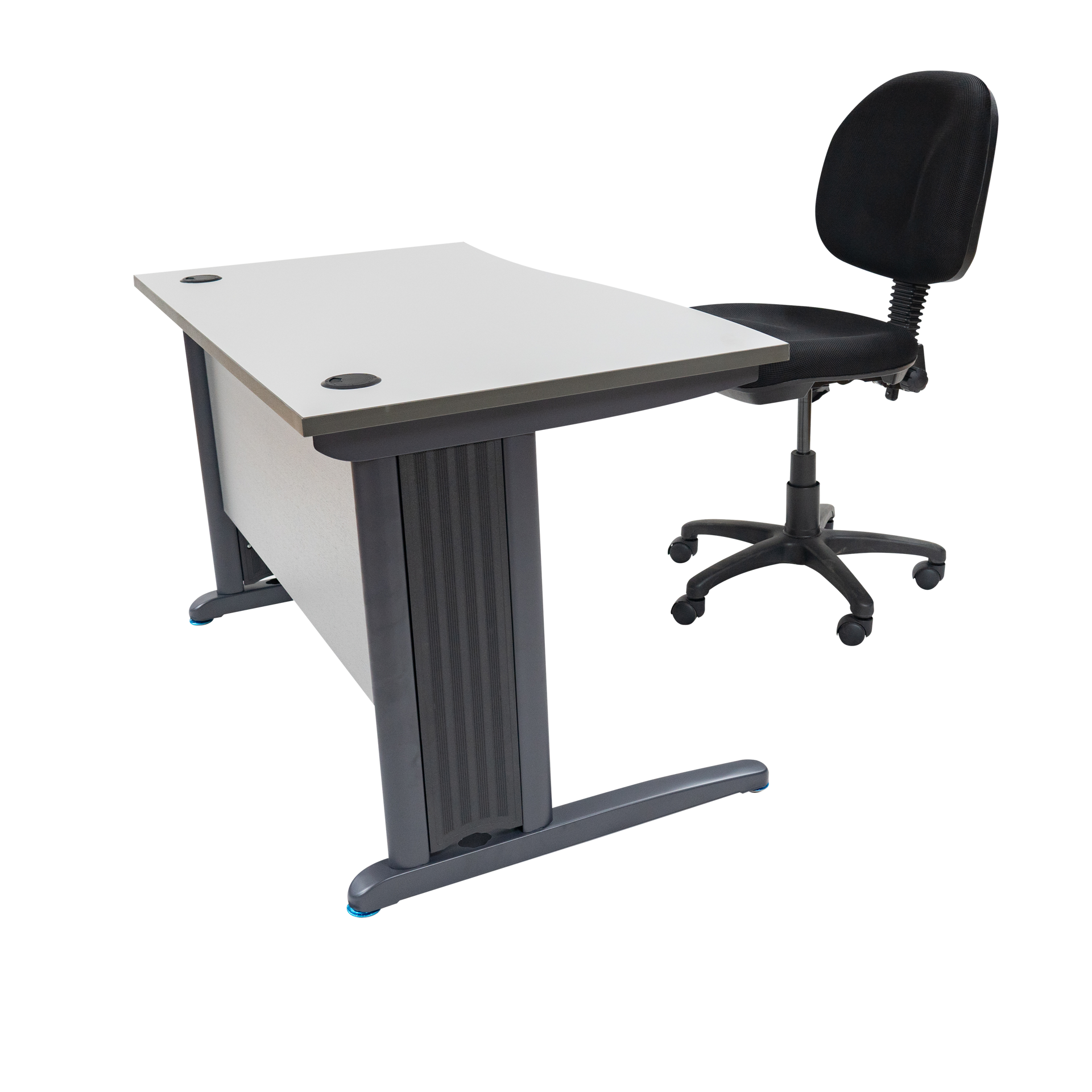 • Large durable work surface with two grommets, metal legs and a modesty panel in front.