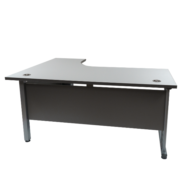 • Large durable work surface with two grommets, metal legs and a modesty panel in front.