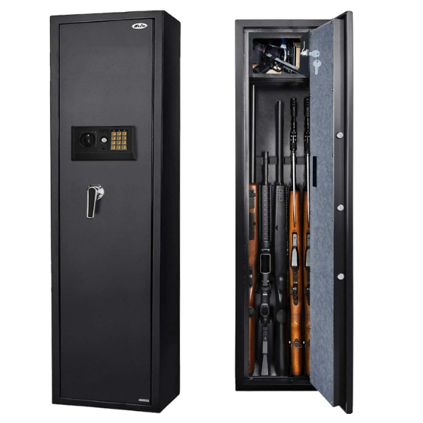 - The safe is a larger and deeper safe that stores up to 5-6 rifles /shotguns up to 50 inches with/without scopes. It is deeper than other safes with only 11 inch and can't fit scoped rifles. It also has a separate lock box inside to store small guns and other valuables in your home or office.