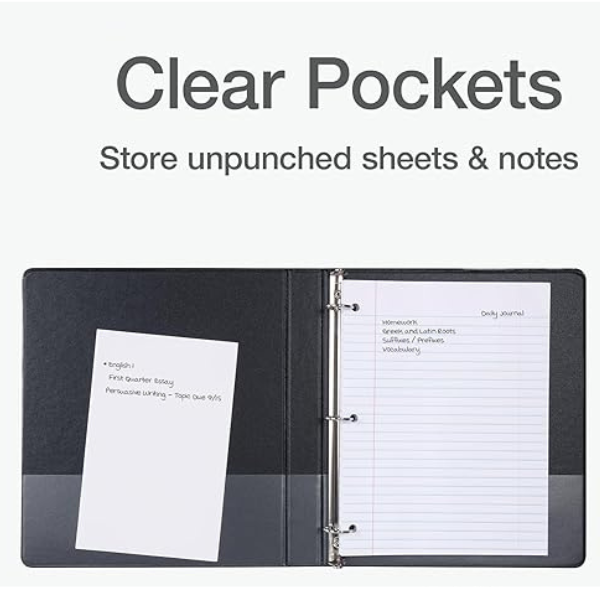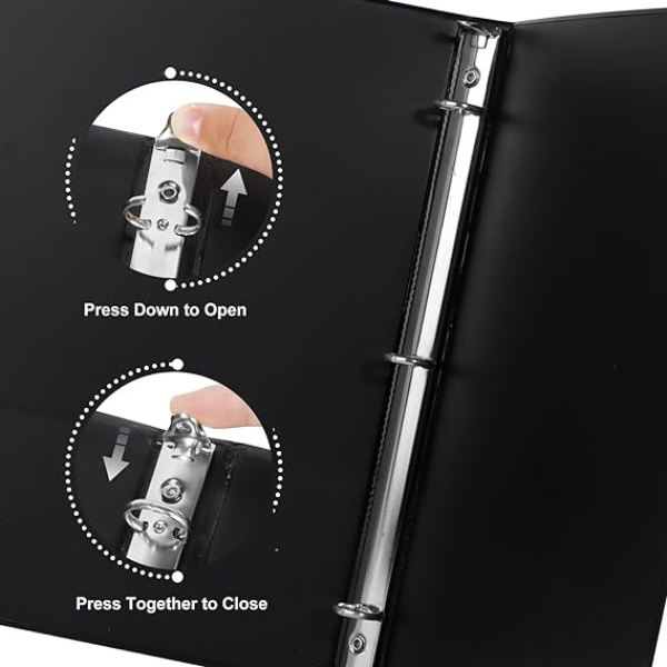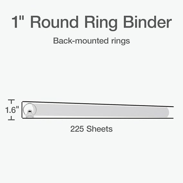 - The slim three ring binder is 1 inch and can hold 225 sheets of paper. The round rings are back mounted which leaves a smooth spine so papers will lay nicer and turn effortlessly. Compact, efficient, and economical.