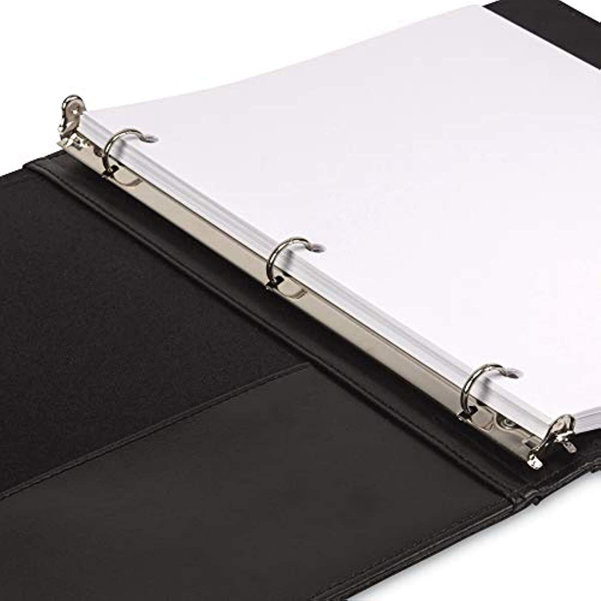The slim three ring binder is .5 inch and can hold 100 sheets of paper. The round rings are back mounted which leaves a smooth spine so papers will lay nicer and turn effortlessly. Compact, efficient, and economical