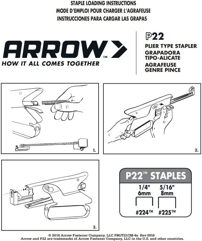 This tool uses Arrow P22 staples (sold separately) in 1/4-Inch and 5/16-Inch; Designed specifically for stapling paper, P22 staples are used on desktops and counters in restaurants, dry cleaners, floral shops, schools, and homes