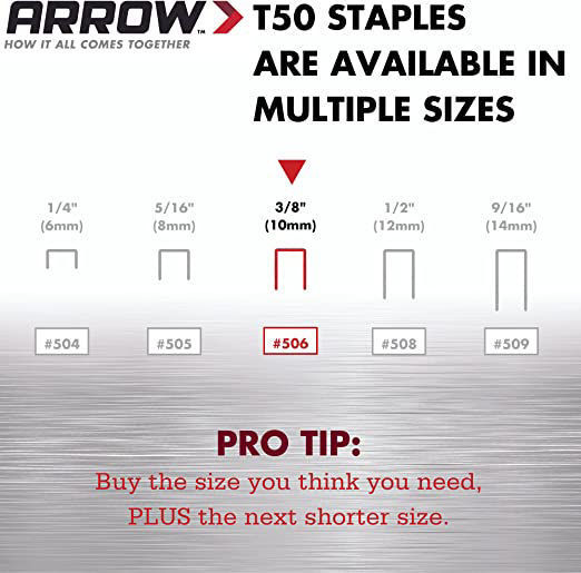 - Leg length 3/8 Inch; Crown width 3/8 Inch; COMPATIBLE TOOLS: T50, T50X, T50HS, 5700, T50RED2, T50PBN, T501, HT50, HT55, HTX50, HT55BL, HT50MG, T50ACD, T50DCD, T50AC, ET501C, ET501F, PT50