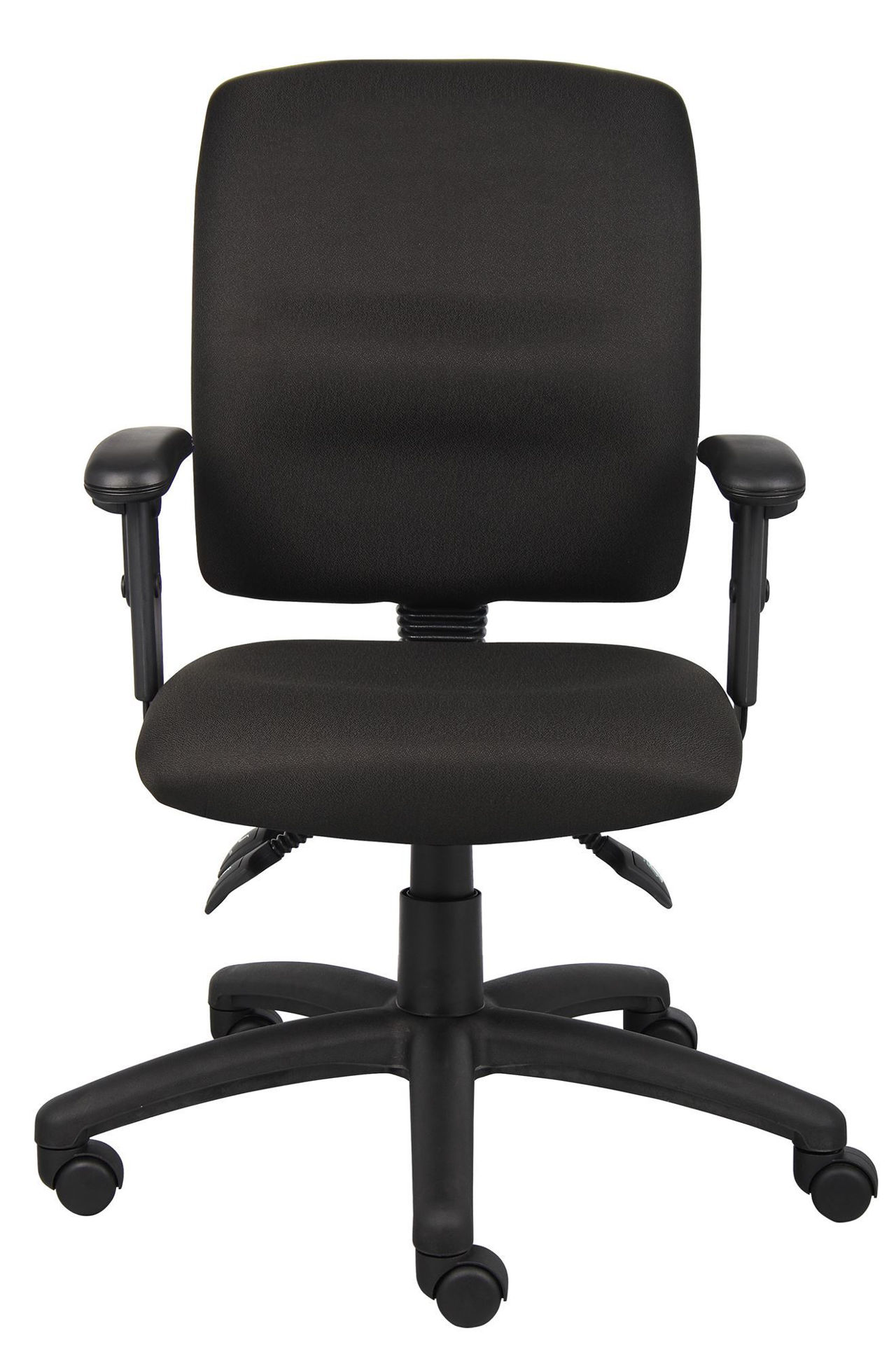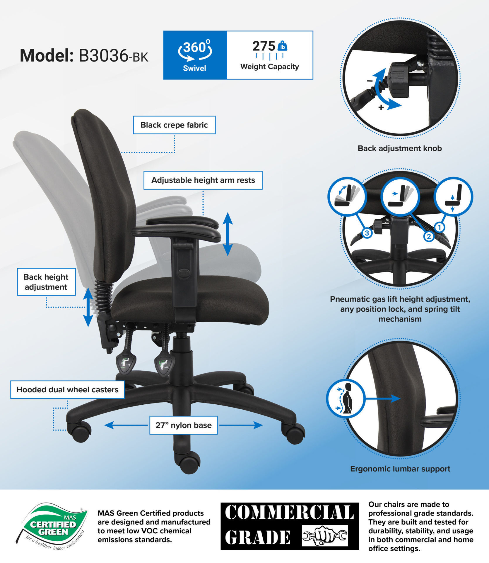 This Multi-Function Budget Task Chair is upholstered in Black Crepe fabric. It comes with an adjustable height back that can be moved to the perfect lumbar support position. The seat tilt lock allows the seat to be locked throughout the tilt range. The back angle lock allows the back to be locked throughout the angle range for perfect back support. The adjustable height armrests have soft polyurethane pads for added comfort. It has a pneumatic gas lift seat height adjustment, allowing for versatile adjustment of the seat height to suit your comfort and work environment. The large 27-inch black nylon base provides added stability to the chair. The hooded double wheel casters make it easy to move and shift directions.