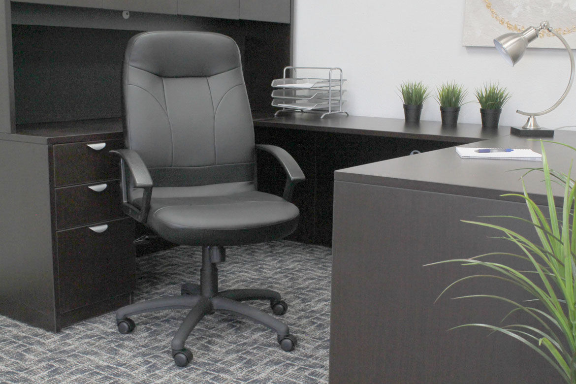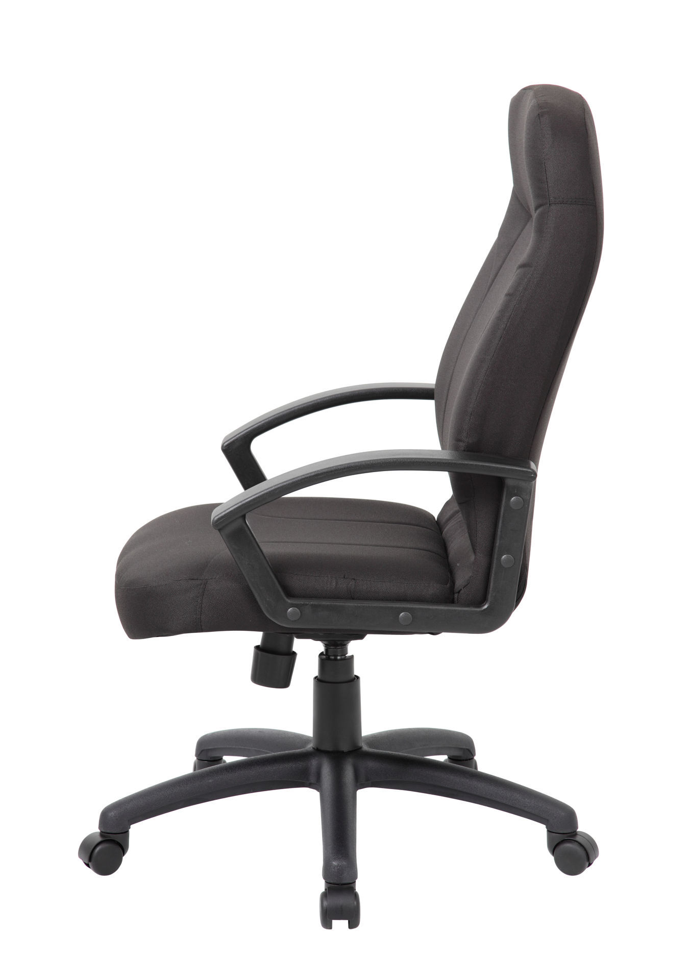 This executive high back chair is elegantly upholstered in black fabric. It has polypropylene arms and a matching 27-inch nylon base with five hooded double wheel casters. In addition to providing optimal stability, this chair can also be personalized for maximum comfort. Its upright locking position, pneumatic gas lift seat height adjustment, and adjustable tilt tension control let users customize the chair to their liking.