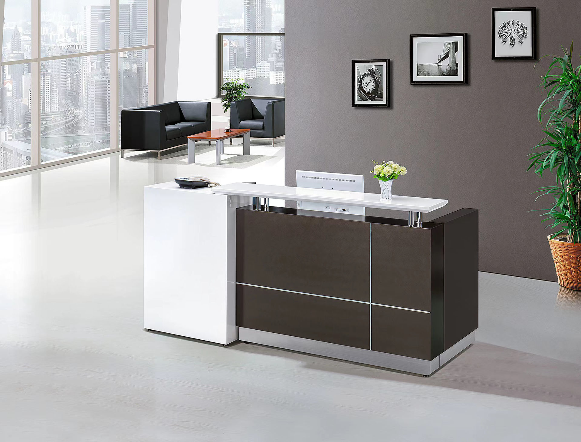 - This eye-catching yet functional reception desk features a height and durable worksurface that will allow you to effectively help all guests as they enter the space. It has a grommet hole to help keep wires, cords and cables organized and out of sight.