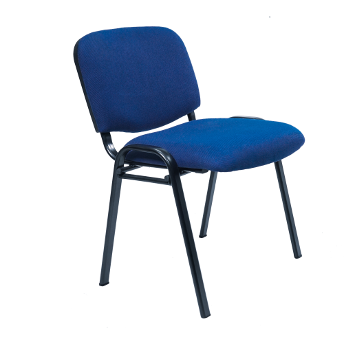 This side chair features a comfortable padded seat and back upholstered in a stylish blue fabric with a black tubular steel frame.