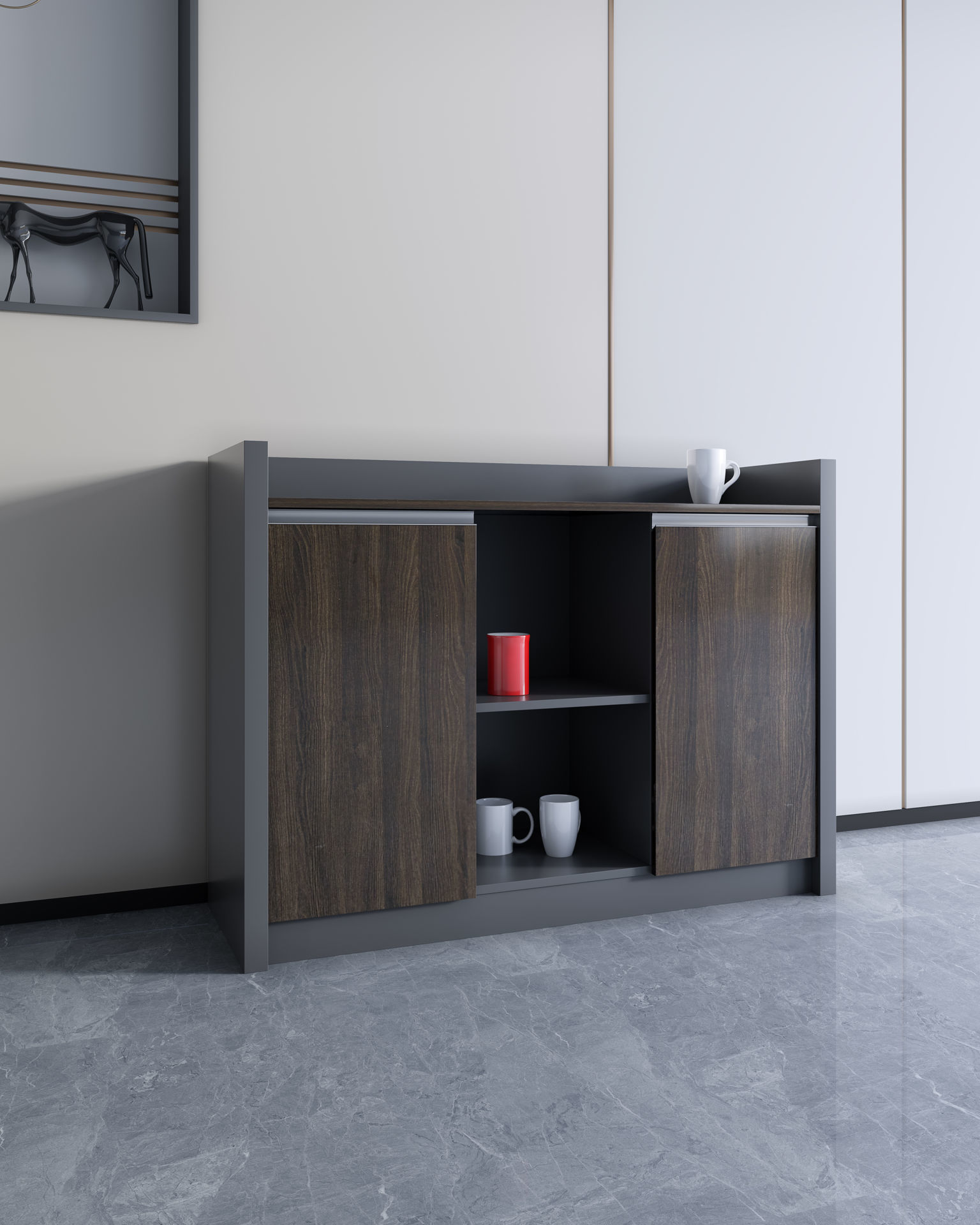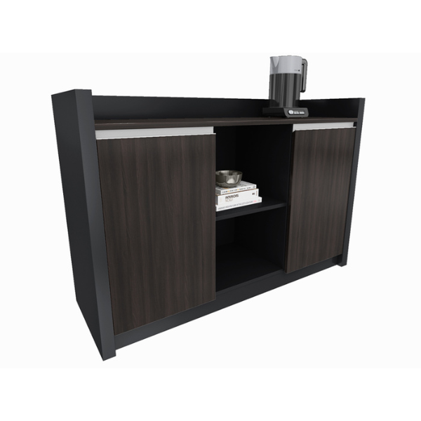 - This cupboard can be placed behind you desk to act as a credenza, used for additional storage space or a coffee/tea station for the office