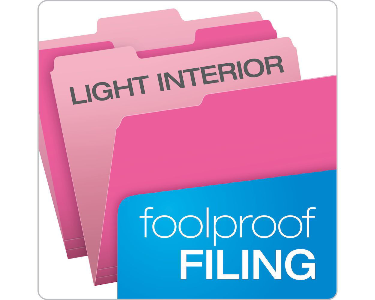 • Pendaflex Two-Tone Color File Folders come in brilliant shades with lighter interiors to prevent time-wasting misfiles. Create bright, color-coded files for fast, efficient filing. 1/3-Cut tabs. Letter size, pink.