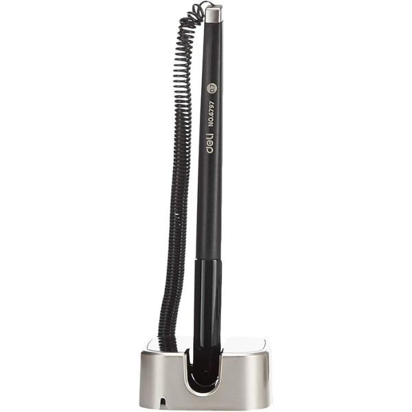 - Deli Desk Pen E6797 features the 180° rotatable cap and spring design for ease of use. The metallic base simply adds style to your office desk or reception counter. Great for office use, reception, counters, and more.