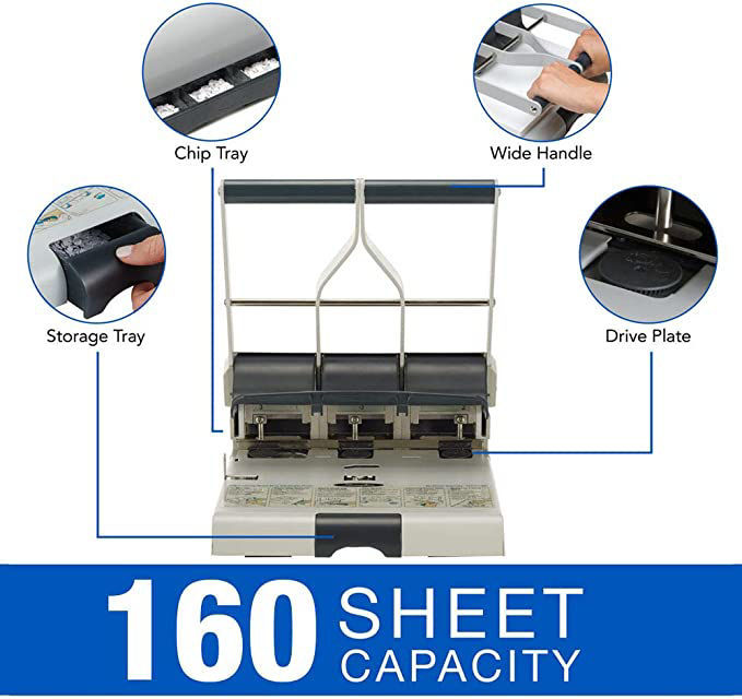 • High capacity punch powers through stacks of paper, piercing up to 160 sheets, with the option of either 9/32" or 11/32" holes.